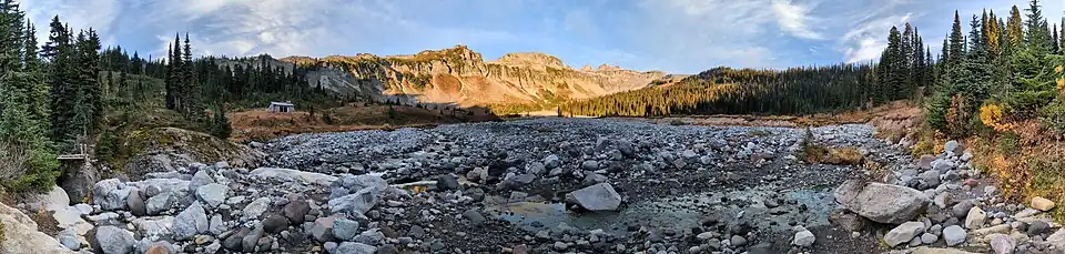 The traditional route between Mowich Lake and the Carbon River is via Ipsut Pass and Ipsut Creek. Many people take an alternative route across Spray Park and Seattle Park, a higher elevation route that often lies under snow until late August.[5]