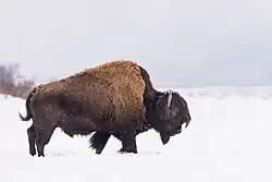 Wood bison are herbivorous grazers that feed primarily on grasses, sedges, and forbs.[29] Due to frequent and heavy snowfall in their native habitat, food availability fluctuates throughout the year, leading to a diverse and varied diet. Deep snow often creates a barrier between the bison and their food source, so they must use their large heads and neck muscles to dig for edible morsels.[30] After the temperature rises and the snow melts, wood bison also feed on silverberry and willow leaves in the summer.[29]
