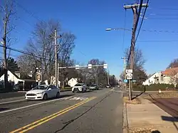 At the intersection with Squirrel Lane/Oak Boulevard, PA 63 briefly forms the border between the borough of Lansdale to the northeast and Towamencin Township to the southwest before fully entering Lansdale and becoming Main Street.[4] The road passes a mix of homes and businesses, coming to a junction with the northern terminus of PA 363 (Valley Forge Road). After the PA 363 junction, the road runs through the downtown area of Lansdale, where the route crosses the Liberty Bell Trail and SEPTA's Lansdale/Doylestown Line at-grade south of the Lansdale station before it intersects Broad Street.[3][4] The road leaves the downtown and heads into areas of homes and businesses.[3] At a crossing of Wissahickon Creek, PA 63 forms the border between Lansdale to the northeast and Upper Gwynedd Township to the southwest.[4]