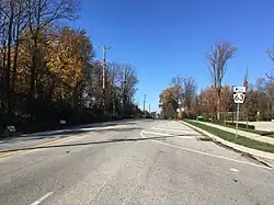 At this point, PA 63 heads into wooded residential areas as a two-lane road.[3] At the intersection with Edge Hill Road, the route turns southwest onto that road and fully enters Abington Township. Farther southwest, PA 63 makes a turn southeast onto Old Welsh Road. The road curves to the east and crosses into Lower Moreland Township.[4] The road becomes Welsh Road again and widens to four lanes as it enters a mix of residential and commercial establishments in the community of Huntingdon Valley, crossing the Pennypack Trail at the Terwood Road intersection and the Pennypack Creek. At the junction with Carson Terrace/Walton Road, there is a westbound jughandle for right turns and U-turns. Upon intersecting PA 232 (Huntingdon Pike) in the community of Bethayres, the route becomes Philmont Avenue and narrows back to two lanes. PA 63 turns south-southeast onto Red Lion Road and crosses SEPTA's West Trenton Line at-grade as it continues through wooded residential subdivisions, making a curve to the southeast and intersecting Pine Road before heading into the city of Philadelphia in Philadelphia County.[3][4]