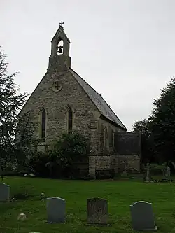 Two bay building with square tower with spirelet. In the foreground are gravestones in a grassy area.