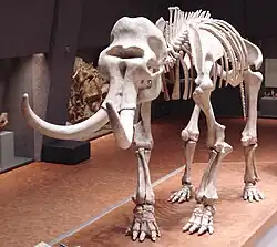 Individuals and populations showing transitional morphologies between each of the mammoth species are known, and primitive and derived species coexisted until the former disappeared. The different species and their intermediate forms have been termed "chronospecies". Many taxa intermediate between M. primigenius and other mammoths have been proposed, but their validity is uncertain; depending on author, they are either considered primitive forms of an advanced species or advanced forms of a primitive species.[29] Distinguishing and determining these intermediate forms has been called one of the most long-lasting and complicated problems in Quaternary palaeontology. Regional and intermediate species and subspecies such as M. intermedius, M. chosaricus, M. p. primigenius, M. p. jatzkovi, M. p. sibiricus, M. p. fraasi, M. p. leith-adamsi, M. p. hydruntinus, M. p. astensis, M. p. americanus, M. p. compressus, and M. p. alaskensis have been proposed.[12][32][33]