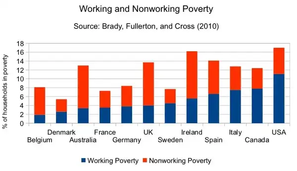 The following graph uses data from Brady, Fullerton, and Cross (2010) to show the working poverty rates for a small sample of countries. Brady, Fullerton, and Cross (2010) accessed this data through the Luxembourg Income Study. This graph measures household, rather than person-level, poverty rates. A household is coded as "poor" if its income is less than 50% of its country's median income. This is a relative, rather than absolute, measure of poverty. A household is classified as "working" if at least one member of the household was employed at the time of the survey. The most important insight contained in this graph is that the US has strikingly higher working poverty rates than European countries.