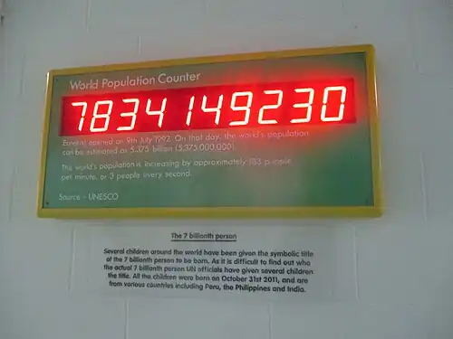 There is no estimation for the exact day or month the world's population surpassed one or two billion. The points at which it reached three and four billion were not officially noted, but the International Database of the United States Census Bureau placed them in July 1959 and April 1974 respectively. The United Nations did determine, and commemorate, the "Day of 5 Billion" on 11 July 1987, and the "Day of 6 Billion" on 12 October 1999. The Population Division of the United Nations declared the "Day of Seven Billion" to be 31 October 2011.[72] The United Nations marked the birth of the eight billionth person on 15 November 2022.[73][67]