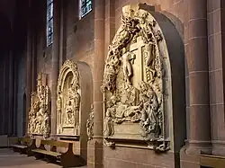 Towards the end of the century, under Bishop Johann von Dalberg, the original Romanesque cloisters (west of the Chapel of St Nicholas) were renovated, resulting in five monumental late Gothic reliefs on the life of Jesus which are now located in the north side-aisle of the cathedral: Tree of Jesse (1488),[3] Annunciation (1487), birth of Christ (1515), entombment (c.1490) and the resurrection (c.1490). A sixth relief depicting the crucifixion was probably lost in the destruction of 1689. In the Andreasstift (Worms) there are four large round keystones about 88 cm (35 in) in diameter decorated with coats of arms, which derive from the cloisters and were donated by Bishop Ruprecht of Regensberg, and Canons Philipp von Flersheim, Erpho von Gemmingen and Wilhelm von Stockheim. Another cloister keystone belonging to the Archbishop of Cologne and cathedral scholaster Hermann IV of Hesse is now located above the entrance of Neuburg Abbey Church in Heidelberg.[4] The foundation stone of the cloisters from the year 1484, which had been thought lost, was found during cleaning in the Dom's lapidarium at the end of February 2014.[5]