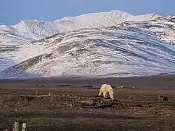Research published in 2017 suggested that the mammoth population was experiencing a genetic meltdown in the DNA of the last animals, a difference when compared with examples about 40,000 years earlier, when populations were plentiful. The research suggests the signature of a genomic meltdown in small populations, consistent with nearly neutral genome evolution. It also suggests large numbers of detrimental variants collecting in pre-extinction genomes, a warning for continued efforts to protect current endangered species with small population sizes.[23] However, this conclusion regarding the mammoth population was disputed in 2024, who found that many of the most deleterious mutations had been purged from the genome, and instead suggested that the extinction was likely due to a catastrophic event, and that the woolly mammoths were already extinct for several centuries prior to the earliest human presence on the island.[24] The earliest evidence of humans (and the only known pre-modern archaeological site on the island) is Chertov Ovrag on the southern coast, a Paleoeskimo short-term hunting camp which dates to around 3,600 years ago. At the camp remains of birds (including the remains of at least 32 snow goose, six long-tailed duck, and one individual each of common murre and snow bunting), as well as two seals (including one bearded seal), a walrus and a polar bear were found in association with stone tools,[25] as well as a toggling harpoon head made of walrus tusk. The tools show cultural similarities to other contemporaneous Paleoeskimo sites in Alaska.[26]