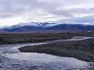 The island's topography consists of a southern coastal plain that is on average 15 km (9.3 mi) wide; a 40 km (25 mi) wide east-west trending central belt of low-relief mountains, with the highest elevations at the Tsentral'nye Mountain Range; and a roughly 25 km (16 mi) wide northern coastal plain. The highest mountain on this island is Gora Sovetskaya with an elevation of 1,096 m (3,596 ft) above mean sea level, although mostly the mountains are a little over 500 m (1,600 ft) above mean sea level. The island's mountain ranges terminate at sea cliffs at either end of the island.[2] Blossom Point is the westernmost point and Waring Point (Mys Uering) the easternmost point of the island. Despite its mountainous terrain and high latitude, Wrangel Island is not glaciated.