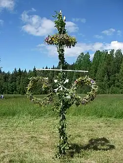 Wreath customs in Europe have survived over many centuries. The observance of May Day in England includes Maypole festivities, culminating in a race by young unmarried men to climb to the top of the Maypole to capture the May Day wreath perched at the top of the pole. The winner of this contest would wear the wreath as his crown, and would be recognized as the May Day King for the rest of the holiday. Plants traditionally used to make Midsummer wreaths and garlands include white lilies, green birch, fennel, St. John's Wort, wormwood,[35] vervain and flax. The flowers used in making the Midsummer wreath had to be picked early in the morning before the dew had dried; the belief was that once the dew dried, the magical properties of the plants evaporated with the dew.[36]