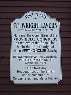 Wright's Tavern was built in 1747 by Ephraim Jones, who operated it until 1751. At the dawn of the American Revolution in April 1775, it was managed by Amos Wright, whose name it has borne ever since. On April 19, the day of the Battle of Lexington and Concord, when the courthouse bell announced the approach of Major Pitcairn's British troops, the Concord Minutemen assembled at Wright's Tavern. Later, after Pitcairn's arrival in the Concord square, British officers refreshed themselves in the tavern.[3]