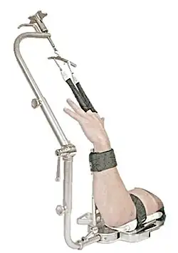 In general, 4.5-6.8 kilograms of traction is implemented with the aid of finger traps. The surgeon can either opt for nylon finger traps or for wire traps. In most cases, nylon finger traps will be preferred to wire traps, as nylon is a more resilient material and thus distributes the traction force to the skin more evenly. Usually, traction is applied to two fingers, namely the index finger and middle finger. Sometimes it may be necessary to more evenly distribute the traction force on the skin, as the patient's skin may be too fragile or atrophic. The traction brought about by the traction apparatus is then applied to three or even four fingers.[5] The surgeon can either opt for dry arthroscopy or for wet arthroscopy. When performing a dry procedure the wrist can still, if necessary, be approached using open surgery. This may, for example, be required when a TFCC lesion is diagnosed. The latter is not possible when a wet procedure is performed, because the fluid that is used causes expansion of the tissue. To improve visualization within the wrist, an inflow irrigation system is used during surgery. Currently, several systems are available, such as gravity flow, a hand pump, large syringes, or a mechanical infusion pump. For irrigation, lactated Ringer’s solution is generally used. The characteristics of lactated Ringer’s solution are that it is physiological and rapidly absorbed. Moreover, the right equipment must be available to finish a complete diagnostic arthroscopy, as well as to perform various operative procedures. Complications of using an irrigation system is that fluid extravasation into the soft tissues of the forearm can result in a compartment syndrome.[5]