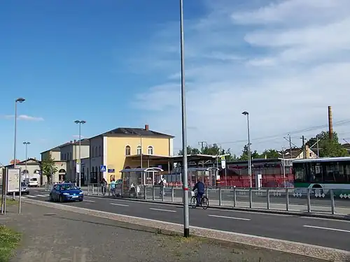 Wurzen station in 2009 with the bus station in the foreground, railway tracks are just behind | |||||||||||||||||||||