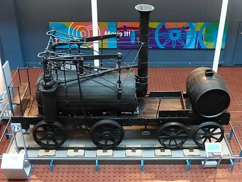 Because it proved too heavy for the cast iron plateway in its original form, the locomotive was rebuilt with eight wheels in 1815, but returned to its original design in 1830 after the track was relaid with wrought iron rails.[6] The locomotive was still at work in 1862 when it was moved to Craghead Colliery.[7] After withdrawal it was presented to the Edinburgh Museum of Science and Art in 1883, now called the National Museum of Scotland, where it is currently on display. The first steam locomotive of its class,[2] Puffing Billy, is in the Science Museum in London.[8]