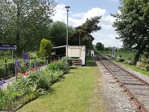 The current Wymondham Abbey railway station, opened in 1999,[5] is the current southern terminus of passenger services on the MNR, although the line continues beyond Wymondham Abbey to a junction with the Breckland Line at Wymondham railway station. The line between Wymondham Abbey and the Breckland Line is used for stock movements,[6] freight and works trains, for the reversal of the majority of hauled passenger trains[7] and, during special events, timetabled passenger services as far as the operational boundary with Network Rail.[8]