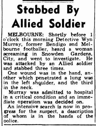 - ^ Stabbed by Allied Soldier, The (Brisbane) Telegraph, (Saturday, 26 February 1944), p.2.