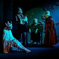 The company make their way to Lancre, and perform the play for the King as asked. However, Hwel, the playwright, maintains that there is something wrong with the plot of the play, something that just doesn't feel right. The witches cast a spell in the middle of the play that causes the actors to portray the killing of the king truthfully, and the audience sees that the Duke and Duchess are guilty of killing Verence I. Felmet finally succumbs to insanity and stabs several people with a retracting stage dagger, before tripping and falling to his death in the Lancre Gorge. The Duchess is imprisoned but manages to escape, only to be killed by a collection of various forest animals who want revenge for the poor treatment of the land.