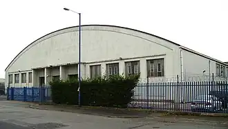 Designed by Manchester City Architects Department under G. Noel Hill,[3] and completed in 1942,[4] the garage was a pioneering example of its type of construction. It is located on Harling Road, off Sharston Road in the Sharston district of Wythenshawe. It was the second-largest reinforced concrete shell roof structure to be constructed in England. The building's structure was particularly innovative for its time. Its concrete arches have a span of 165 feet (50 m) from side to side, are 42 feet (13 m) high[5] and spaced 42 feet (13 m) apart. The tensile concrete shell roof between these concrete arches is just 2.5 inches (64 mm) thick and is punctured by large rooflights. Wythenshawe Garage proved to be the model for much larger buildings using the concrete shell roof structure technique, which was an economic method of achieving large uninterrupted roof spans.
