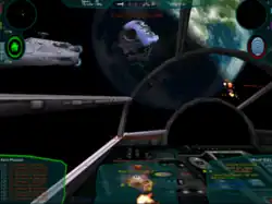 The ability to fly multi-crew craft like the Millennium Falcon was a major new feature because the player could freely choose to be the pilot or operate one of the turrets. The AI would take over any position not controlled by the player, but could be given orders by the player. X-Wing Alliance also introduced multi-part missions that involved making hyperjumps from one region to the next; in previous games, any hyperjumps the player experienced were either to start or end the mission.[3] Additionally, players could now enter a starship's hangar bay to rearm and/or receive repairs before rejoining the fight. They could even witness the battle continuing to unfold outside the hangar. Finally, X-Wing Alliance added a much-desired custom mission builder feature. This allowed players to quickly set up a variety of battle scenarios involving almost every vessel in the game, including dozens of fighters and combat transports that had been fought against in the single-player game and were now flyable in this mode. this included various fighters and also larger spacecraft. [4]