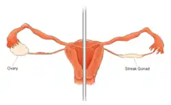 XX gonadal dysgenesis is a type of female hypogonadism in which the ovaries do not function to induce puberty in an otherwise normal girl, whose karyotype is 46,XX.[1] Individuals with XX gonadal dysgenesis have normal-appearing external genitalia as well as Müllerian structures (e.g., cervix, vagina, uterus). Due to the nearly absent or nonfunctional streak ovaries (under-developed ovaries that are then small and fibrous tissue, hence the term "streak"),[2] the individual is low in estrogen levels (hypoestrogenic) and has high levels of follicle-stimulating hormone (FSH) and luteinizing hormone (LH), hormones that cycle in the reproductive system.[3] As a result, the diagnosis often occurs after a concern for delayed puberty or amenorrhea. Treatment generally involves hormone replacement therapy with estrogen and progesterone.[4]