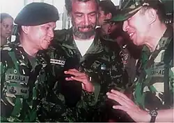 As a result of his high profile, Gusmão became a prime target of the Indonesian government. Indonesian troops (TNI) attempted to capture Gusmão in the Same and Ainaro area on 14 November 1990 with Operasi Senyum ("Operation Smile"). Four days earlier, a woman had been captured who testified during interrogation that the rebel leader was staying at a nearby mountain. Xanana Gusmão, however, probably escaped one night before the attack. After the attack, in which twelve battalions and four helicopters were deployed, the military claimed to have found about 100 fighters. Also found was a container with Gusmão's documents, a video camera and his typewriter. Among the documents were letters from the Pope and Bishop Carlos Belo.[10] According to a traditional Timorese legend, some warriors were able to transform themselves into dogs to escape their captors. Picking up on this myth, the legend spread that Gusmão could also turn into a white dog and thus run around the village unnoticed while the Indonesian soldiers were looking for him.[11]
