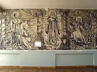 Xaverius College enrolls about 900 students, girls and boys, between 6 and 18 years old. It is a mix of old and new buildings around the recreation areas and the monastery garden. A group of Jesuits live nearby but they no longer teach as they used to. The long corridors on the monastery's ground floor are lined with the masterpieces of Alfred Ost, a well known Flemish artist. During his lifetime he was a poor man. He would visit and eat with the Jesuits in the community. Instead of paying them with money, he drew big scenes on the white walls.[1]