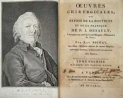 In 1797, Bichat began a course of anatomical demonstrations, and his success encouraged him to extend the plan of his lectures, and boldly to announce a course of operative surgery.[9] At the same time, he was working to reunite and digest in one body the surgical doctrines which Desault had published in various periodical works;[9] of these he composed Œuvres chirurgicales de Desault, ou tableau de sa doctrine, et de sa pratique dans le traitement des maladies externes (1798–1799), a work in which, although he professes only to set forth the ideas of another, he develops them "with the clearness of one who is a master of the subject."[9]