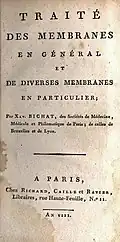 In 1798, he gave in addition a separate course of physiology.[9] A dangerous attack of haemoptysis interrupted his labors for a time; but the danger was no sooner past than he plunged into new engagements with the same ardour as before.[9] Bichat's next book, Traité des membranes (Treatise on Membranes), included his doctrine of tissue pathology with a distinction of 21 different tissues.[16] As worded by A. S. Weber,