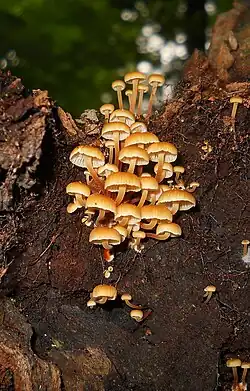 Xeromphalina campanella is a lookalike species that grows on rotting conifer wood.[2]