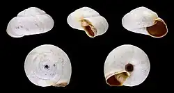 The shell is always white with brown spiral bands.[3] The shell is medium-sized to small with a subdepressed to subconoidal spire.[3] The umbilicus is open.[3]