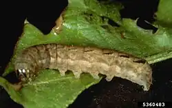 The larva feeds on various crop plants, including barley, clovers, corn, tobacco as well as apple and maples.