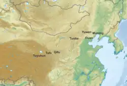 Many of the Xianbei tribes migrated south and settled on the borders of the Wei-Jin dynasties, where they often offered their submission. In 258, the Tuoba tribe settled in the abandoned city of Shengle, north of the Yin Mountains.[12] To the east of them, the Yuwen tribe settled between the Luan River and Liucheng, while the Murong tribe were allowed to move deeper into Liaodong. The Duan tribe was founded in Liaoxi within the Great Wall by a Xianbei ex-slave along with a group of exiles. In the west, an offshoot of the Murong moved into northern Qinghai and mixed with the native Qiang people, becoming the Tuyuhun.[46] The Qifu tribe settled near the Longxi basin, while a branch of the Tuoba, the Tufa tribe, roamed the Hexi corridor. In 270, the Tufa chieftain, Tufa Shujineng, led the various ethnic tribes in the northwest in a rebellion against the Jin dynasty in Qin and Liang provinces but was defeated in 279 by Ma Long.[1]