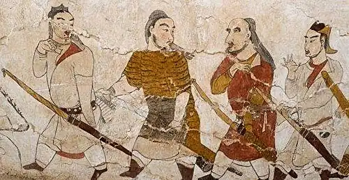 Xianbei figurines help to portray the people of the society by representing pastimes, depicting specialized clothing, and implying various beliefs. Most figurines have been recovered from Xianbei tombs, so they are primarily military and musical figures meant to serve the deceased in afterlife processions and guard their tomb. Furthermore, the figurine clothing specifies the according social statuses: higher-ranking Xianbei wore long-sleeved robes with a straight neck shirt underneath, while lower-ranking Xianbei wore trousers and belted tunics.[86]