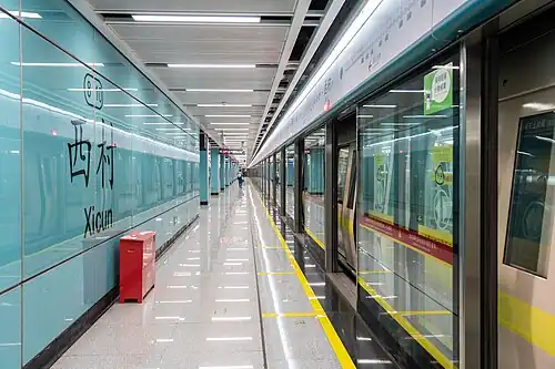 Xicun Station (Chinese: 西村站; Cantonese Yale: Sāichyūn Jaahm) is an interchange station between Line 5[1] and Line 8[2] of the Guangzhou Metro. It is located under the junction of Huanshi Road West (环市西路) and Xizeng Road (西增路) in the Liwan District. Huanshi Road West is one of the main shopping areas for shoes in Guangzhou.[3][4][5] The station opened on 28 December 2009.[6]