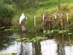 Another migratory bird seen in the winter is the great egret, which grows to up to a meter in height. Some rare birds that have been seen here include the common kestrel, the osprey and certain types of owl. The most commonly observed migratory species is the American white pelican, which was not seen in the area before the lake and canals were restored.[15] However, this species has only been seen in numbers since the 2000s, with 500 reported as of 2009.[8][13] These birds migrate here from Canada and the northern US.[16] Another important species is the kingfisher, which was earlier thought to be extinct in the area, but has been seen again.[15]