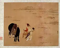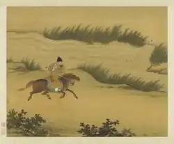 As a child, Zhu Zhanji was trained in both military skills and Confucian literature by Hanlin academics. He was a talented man of letters, but his physical prowess, in contrast to his father's frail health, made him excel in military disciplines. This impressed the Yongle Emperor,[1] who shared Zhu Zhanji's love for hunting and riding.[5] The Yongle Emperor allowed Zhu Zhanji to accompany him on hunting trips and military inspections. In 1414, the emperor even took the prince with him on a campaign against the Mongols.[3] Later, as emperor, Zhu Zhanji personally participated in skirmishes with the Mongols on the northern border. During one of these battles, he demonstrated his skill with a bow by shooting several Mongol warriors.[1]