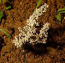 The species was described from Taiwan in 2017 as arising from the soil with a main axis to about 2-5 cm height. There is repeated branching of the structures ending in gray conidium bearing parts. The stipe is black and glabrous with the interior gray to brown. The species is known only from the anamorph and no teleomorphic structures have been observed. The stromata resemble that of Xyloroemium flabelliformis and while most Xylaria produce anamorph and teleomorphs from the same stromata, it has been suggested that the teleomorph may possibly arise from separate stromata as in Xyloroemium.[1] Several Xylaria species are known to be associated with termite nests, growing from the fungus combs of the termites, but many grow on rotting wood and other substrates. No specific substrate was traceable in Xylaria terricola and it appears to grow in soil.[1] The termitophilic Xylaria species are placed in the subgenus Pseudoxylaria. DNA sequence analysis places Xylaria terricola within the termitophile clade.[2]