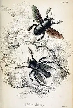 | Xylocopa tenuiscapa (male, top) as depicted in Jardine's The Naturalist's Library | |
