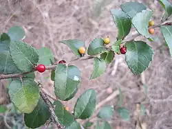 Xylosma flexuosa, commonly known as brushholly or coronilla,[3] is a species of flowering plant in the family Salicaceae, that is native to southern North America and northern South America. Its range stretches from southern Texas in the United States south through Mexico and Central America to Venezuela. It can also be found on the island of Curaçao in the Netherlands Antilles.[2] Brush holly is a spiny[4] evergreen[3] shrub, usually reaching a height of 1–2 m (3.3–6.6 ft)[4] but able to attain 6–8 m (20–26 ft) in height.[5] Red and yellow berries[3] around 7–8 mm (0.28–0.31 in) in diameter[5] are found on the plant throughout the year. It is sometimes cultivated as an ornamental hedge.[6]