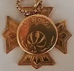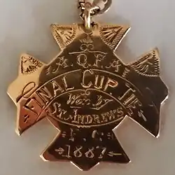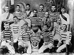 The following Saturday saw St Andrew's play Rangers (who wore white with red trim) at 3 PM on the "Pineapple Ground, Kangaroo Point", in front of 100 spectators. The game ended in a 1-1 draw, with the Brisbane Courier reporting "Thus ended a most exciting contest. Some neat passing occurred at intervals, and the ball was often "headed", and the play in general was a great improvement on that of the previous Saturday."[22] Rangers and Queen's Park (captained by Andrew Rankine and Arthur Princeps respectively) did not meet until the fourth match of the season, played at the Pineapple Ground on 18 July 1884, where the Rangers won 3-1 in front of a crowd of around 100 people.[23] The final tie of that season between St Andrew's and Rangers was held at the Queen's Park ground on Saturday 9 August. The players were presumably playing as amateurs, as a newspaper advertisement promoting that game noted that "Collection Boxes in aid of the Hospital will be at Garden Gates."[24] The match was won by Rangers 1-0 and they were awarded the winners' badges.[25]