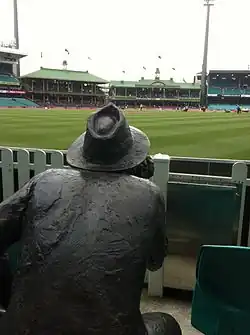 "The Hill" area was replaced with seating in the early 1990s. The new area was then formally named Yabba's Hill in honour of his colourful comments, several of which have passed into cricketing folklore. In 2007 the Doug Walters Stand and Yabba's Hill were demolished to make way for the new Victor Trumper Stand. On 7 December 2008 a bronze statue of Yabba, sculpted by Cathy Weiszmann, was unveiled at the Sydney Cricket Ground in The Hill area of the new stand.[3] It depicts Yabba in a characteristic pose, one hand acting as a megaphone, in the act of delivering one of his famous interjections.[4]