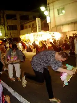 The Yagibushi (Japanese: 八木節; meaning song of yagi [1]) is a popular folk song and dance performed at matsuri (and occasionally Undokai sports days) in Gunma and Tochigi, Japan. It consists of dancers with broad hats called kasa going in a counter clockwise circle around a mikoshi. The dance is very energetic and ends with everyone throwing their hats in the air. The "Yagi" (八木, literally "eight trees") came from Yagi-shuku, one of the post stations on the Nikkō Reiheishi Kaidō Road, and is not to be confused with the "yagi" (山羊, goat).