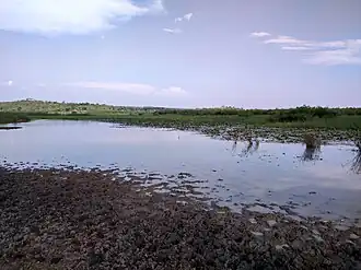 In the past the Yala River flowed through the eastern 20% of the Yala Swamp into Lake Kanyaboli, then into the main swamp, and then through a small gulf into Lake Victoria. Today the eastern part of the swamp has been drained, and the river flows directly into the 8,000 hectares (20,000 acres) main swamp. It is cut off from Lake Kanyaboli by a silt-clay dyke. Lake Kanyaboli now receives its water from the surrounding catchment area and from back-seepage from the swamp. The river's gulf has been cut off from the lake by a culvert, which created the 500 hectares (1,200 acres) Lake Sare through back-flooding.[3]