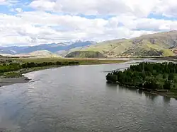 The Yalong has its source in the Bayan Har Mountains on the Tibet–Qinghai Plateau in Chindu County, Yushu, Qinghai, where it is known as the Za Qu (Chinese: 扎曲).[4] Flowing southeasterly, the Yalong gradually turns south at Garzê and travels between the Shaluli Mountains to the west and the Daxue Mountains to the east.[5] The Yalong River channel runs through a deep gorge for much of its length south of Garzê. The southern Sichuan-Tibet Highway crosses the Yalong at Yajiang in the middle of the river's course. In Liangshan Prefecture, the river wraps 150 km (93 mi) around the Jinping Mountains creating the Jinping Bend.[5] Here, water from the Yalong River has been diverted under the mountains as part of the Jinping-II Dam hydroelectric project. The Yalong meets the main stem of the Yangtze (Jinsha) River in Panzhihua, Sichuan.[6]
