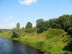 The fortress was built on a high steep coast at the outside of the river bend. That gave additional obstacle for assault. From all sides fortress was surrounded by water: it had Luga river on its western side and moats on others.[38] Fortress itself was built in trapezoid shape facing the river with a long base that also was slightly concaved. Walls was folded of limestone and was up to 4,5 meters wide. At the corners the fortress had 4 round towers, which were supplemented by square towers in the middle of western, northern and eastern walls. That gave the defenders an opportunity to crossfire. The detinets was located at the south-western corner of fortress and had mutual gates with it. A gate was placed westwards in two related square halftowers made of coarse limestone blocks stapled with mortar. Passage was 2 meters wide and 17.5 meters long had 3 gates in it and a pit in front of the entrance with a single drawbridge.[14][39]