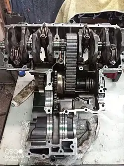 The XS 1100 four-cylinder engine employed the same 68.6 mm stroke of the XS 750 triple, but had a larger 71.5 mm bore (the XS 750 had a bore of 68 mm) and therefore was an "oversquare" or "short-stroke" design. The XS1100 engine does not transmit power directly from the crankshaft to the clutch basket/input shaft, but rather via a wide hy-vo chain onto an intermediate jack-shaft with a cush-drive damper.