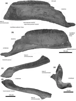 The holotype MNHAH D1-033516, consisting of part of the right lower jaw, twelve teeth, four cervical vertebrae, three cervical ribs, a partial right coracoid and a posterior caudal vertebra, was discovered on Awaji Island in Japan in May 2004 by Shingo Kishimoto. In 2005, the find was reported in the scientific literature.[2] Kishimoto in 2013 donated the holotype to Japan's Museum of Nature and Human Activities in the Hyogo Prefecture, where the fossils were prepared by Kazumi Wada, Tomomi Ikeda and Chisato Ota to be described in 2021. The species Yamatosaurus izanagii was named in 2021 by Yoshitsugu Kobayashi, Ryuji Takasaki, Katsuhiro Kubota and Anthony Ricardo Fiorillo. The fossils were found in dark grey mudstones within the upper part Kita-Ama Formation, which was deposited in marine conditions in distal turbidite facies on the edge of the continental slope in an intra-arc basin. The sediments date to subchron 32.1r28, corresponding to the early Maastrichtian stage of the Late Cretaceous, around 71.94–71.69 million years ago, making it roughly contemporaneous with fellow Japanese hadrosaur Kamuysaurus.[1]