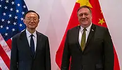 In March 2021, Yang led the Chinese delegation for a strategic dialogue with the US in Alaska. The US team was headed by the Secretary of State Antony Blinken, in the first interaction with China during the Biden Administration. In the opening session in the presence of media, after 2-minute opening remarks by Blinken, Yang responded with an unexpected 16-minute speech.[17] He said that it was necessitated by the "tone" of the US delegation.[18] He harangued the United States for its human rights record, called it a global "champion of cyber attacks", and declared that "many people within the United States actually have little confidence in the democracy of the United States".[19]