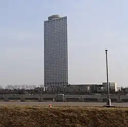 The Yanggakdo International Hotel is the largest operating hotel in North Korea, pending the completion of the Ryugyong Hotel, and the country's seventh- or eighth-tallest building.[1][2][3] The hotel is located on Yanggak Island in the River Taedong, two kilometres (1.2 mi) to the south-east of the centre of Pyongyang, the nation's capital. It rises to an overall height of 170 metres (560 ft) and has a slowly revolving restaurant on the 47th floor.[4]