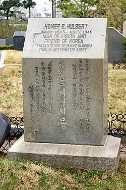 - Homer Hulbert (1863–1949) American missionary and journalist whose headstone proclaims "I would rather be buried in Korea than in Westminster Abbey."