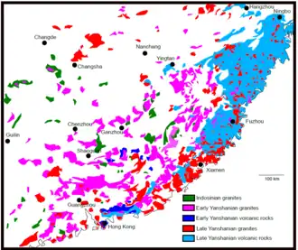 Following the traditional definition, the South China Block was formed by the collision between the Yangtze Block and the Cathaysia Block in the Neoproterozoic.[17] The unified South China Block experienced four important events in the Phanerozoic. They are called the Wuyi-Yunkai Movement (Early Paleozoic), the Emeishan flood basalt magmatism (Late Paleozoic), the Indosinian Movement (Triassic) and the Yanshanian Movement (Jurassic-Cretaceous). The three movements created an array of deformation, magmatism and metamorphism in the South China Block.