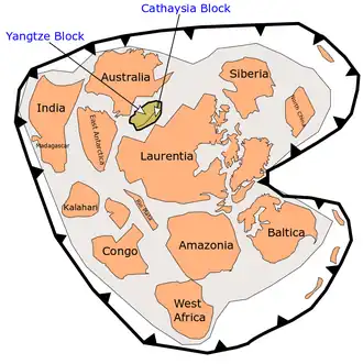 On the other hand, the South China Block may be located in the periphery of Rodinia. It might be next to northern India and western Australia.[38]